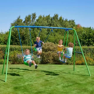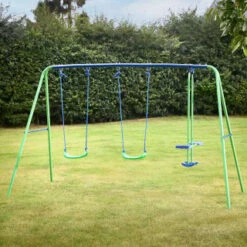 The Double Swing and Glider Set boasts a durable, powder coated steel frame, with a wide ‘A’ style frame providing extra stability.