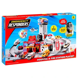 Create an emergency scene with this hospital and fire station playset! This amazing playset includes 2 emergency vehicles – and a real working walkie talkie loudspeaker.