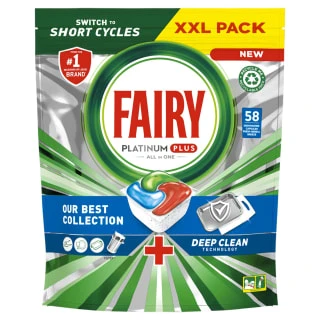 Fairy Platinum Plus Deep Clean tablets clean 99% of visible and invisible food residues. Fairy Platinum Plus dishwasher capsules with three liquid chambers dissolve fast, even in lower temperatures.