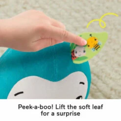 For more hands-on fun, there’s a soft cord tail to grasp and pull and a peek-a-boo leaf on the monkey’s head. Hey, who’s hiding under there?