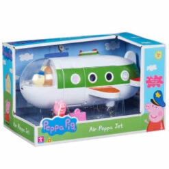 Free-wheeling Jet with open up cockpit. Includes articulated Peppa figure. Flip-over Miss Rabbit pilot or a seat for Peppa to fly the jet!. Open the doors & lower the stairs. Load the suitcase in the baggage compartment.
