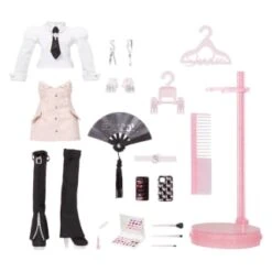 Karla Choupette is Light Pink from head to toe. She expresses her own style in a pink and white dress with pockets on the side and silver details, white shirt and tie, belt with S buckle, gloves, earrings, a pair of knee-high boots with zipper detail, and fun accessories including hand fan with a tassel. And she has beautiful curled pink, long hair, long real eye lashes and glass eyes.